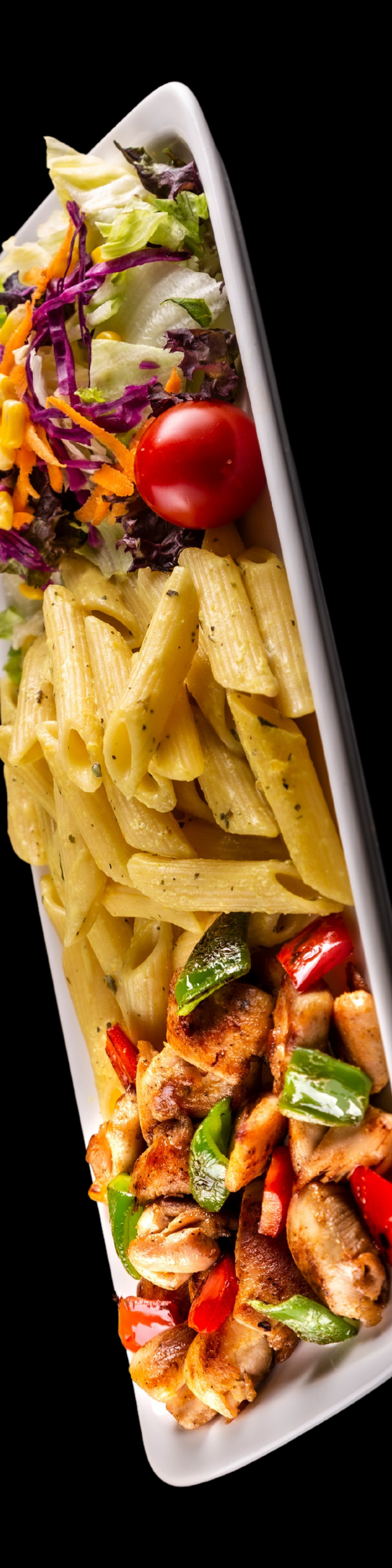 200 gr. Tavuk, Renkli Biber, Acı Sos, Makarna ve Garnitür Salata Eşliğinde